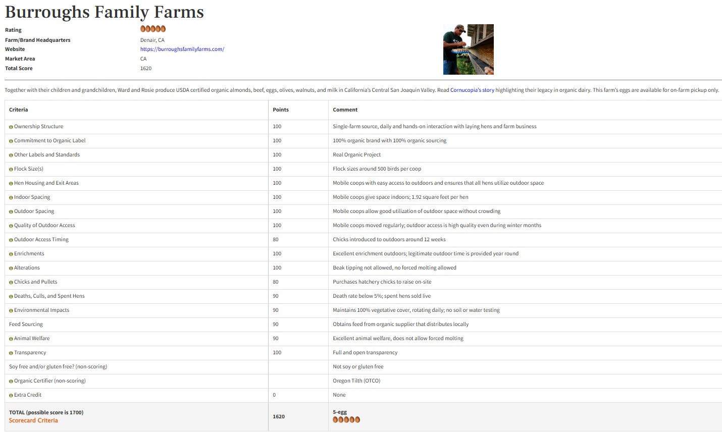 캘리포니아 소재지의 1620점을 획득한 버로우스 패밀리팜(Burroughs Family Farm)의 다소 생소한 브랜드지만, 코뉴코피아 스코어카드 기준 5점 만점의 5점 달걀이다.