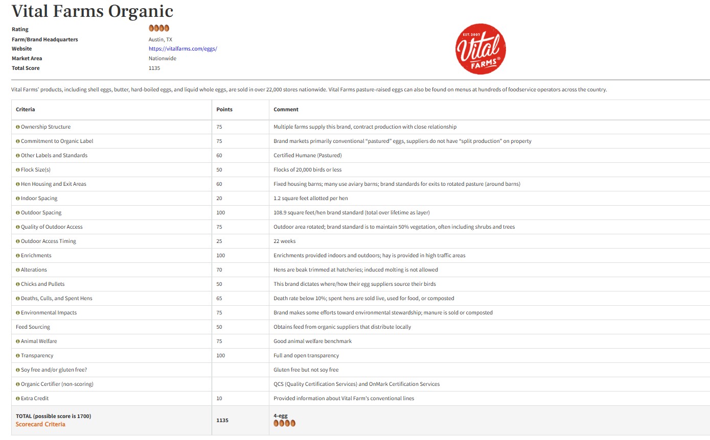 달걀 농장의 경우, 닭이 단순히 밖으로 나갈 수 있는 통로만 있는 것이 아니라 실제로 외부 환경을 얼마나 이용할 수 있는지에 대한 실외 접근성 및 환경, 실내외에서 닭 한 마리 당 충분한 면적이 확보되어 날개를 펼치거나 자연스러운 행동을 할 수 있는지 측정하는 사육 밀도, 병아리를 산란계로 성장하기까지 전 과정을 농장에서 관리하는지, 대두나 옥수수 사료 의존도, 닭의 자연 폐사 및 노계 처리 방식 등 다양한 항목들을 갖추어 점수화하고 있다.
