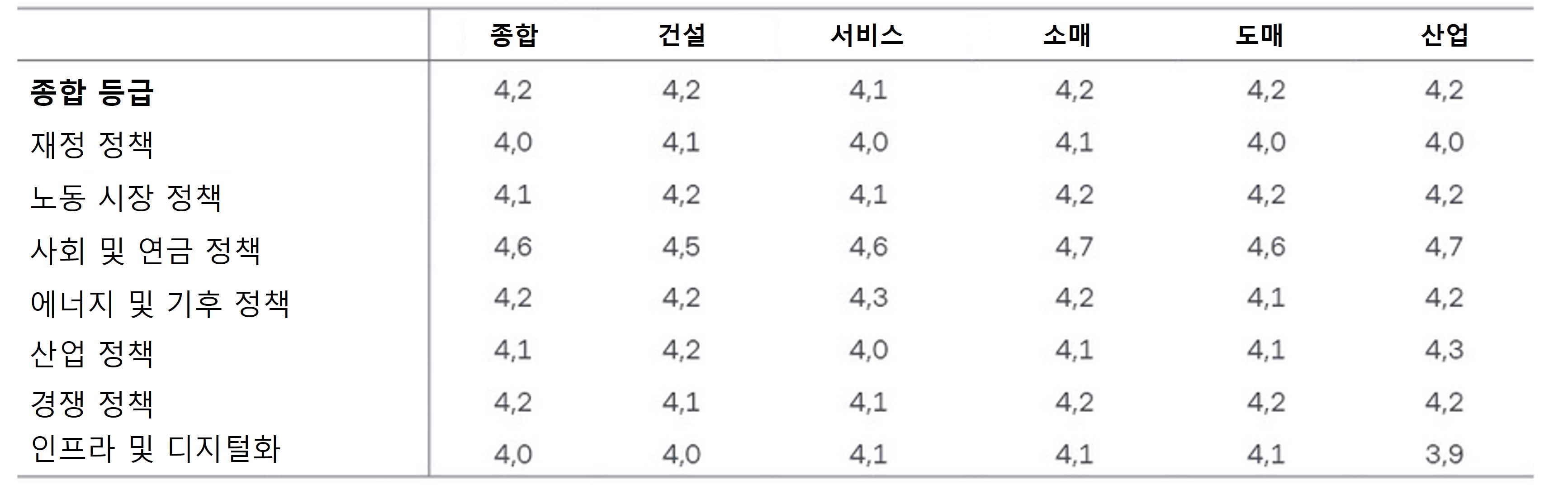 한편, 독일 산업계는 연방정부의 경제 정책에 대해 전반적으로 부정적인 평가를 내렸다. 독일 뮌헨 소재 ifo 경제연구소가 지난 2월 5일 발표한 월간 기업 환경 조사 결과에 따르면, 약 6300개 기업이 평가한 연방 정부의 경제 정책에 대한 종합 점수는 평균 4.2점(최고 1점~최저 6점)으로 다소 불만족스러운 것으로 나타났다. 개별 정책 영역에서는 사회 및 연금정책(4.6점)이 가장 낮았으며, 노동, 에너지, 산업, 경쟁 정책은 평균 4.1과 4.2사이로 보통 이하 수준이였고, 재정 정책과 인프라 및 디지털화(4.0)는 상대적으로 ‘충분함(sufficient)'의 점수를 받았다. 업종별 평가 차이도 거의 나타나지 않아, 특정 정책에 대한 명확한 비판보다는 경제 정책 전반을 부정적으로 평가한 것으로 보인다.