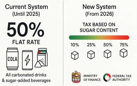UAE 연방국세청(Federal Tax Authority, FTA)은 2026년 1월부터 가당 음료(Sweetened Drinks)에 대한 소비세 과세 방식을 개편했다. 이번 조치는 고당 음료 소비 억제와 건강 유해 가능 제품에 대한 과세 체계 정교화를 목적으로 하며, 가격 기준 비례세에서 당 함량 기준 종량세로 전환하는 데 중점을 두고 있다. 이는 내각결정 제 197-2025호(Cabinet Decision No. 197 of 2025)에 의거한다.