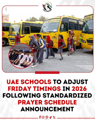 금요일 기도 시간 변경에 따른 교육 일정 조정으로 2026년 1월 9일부터 두바이 내 사립학교의 금요일 수업 시간이 단축되었다. 두바이 지식·인적개발청(Knowledge and Human Development Authority, KHDA)은 지난해 연말 발표한 지침을 통해, 두바이 소재 사립학교 및 유아 교육기관의 금요일 수업을 오전 11시 30분 이전에 종료하도록 조정한다고 공지했다.
