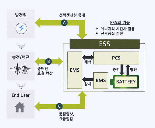 ESS는 생산된 전력을 저장해 두었다가, 전력이 가장 필요한 시기에 공급하여 에너지 효율을 높이는 일종의 '전력용 대형 보조 배터리'다. ESS는 전력을 담는 배터리 외에도 전기를 관리하고 변환하는 여러 장치가 결합되어 있는데, 일본 경제산업성은 일본 국내 ESS 등 정치(定置)용 배터리 시장 규모를 2019년 1조엔에서 2030년 7조엔, 2050년 47조엔 까지 확대될 것으로 전망하였다.