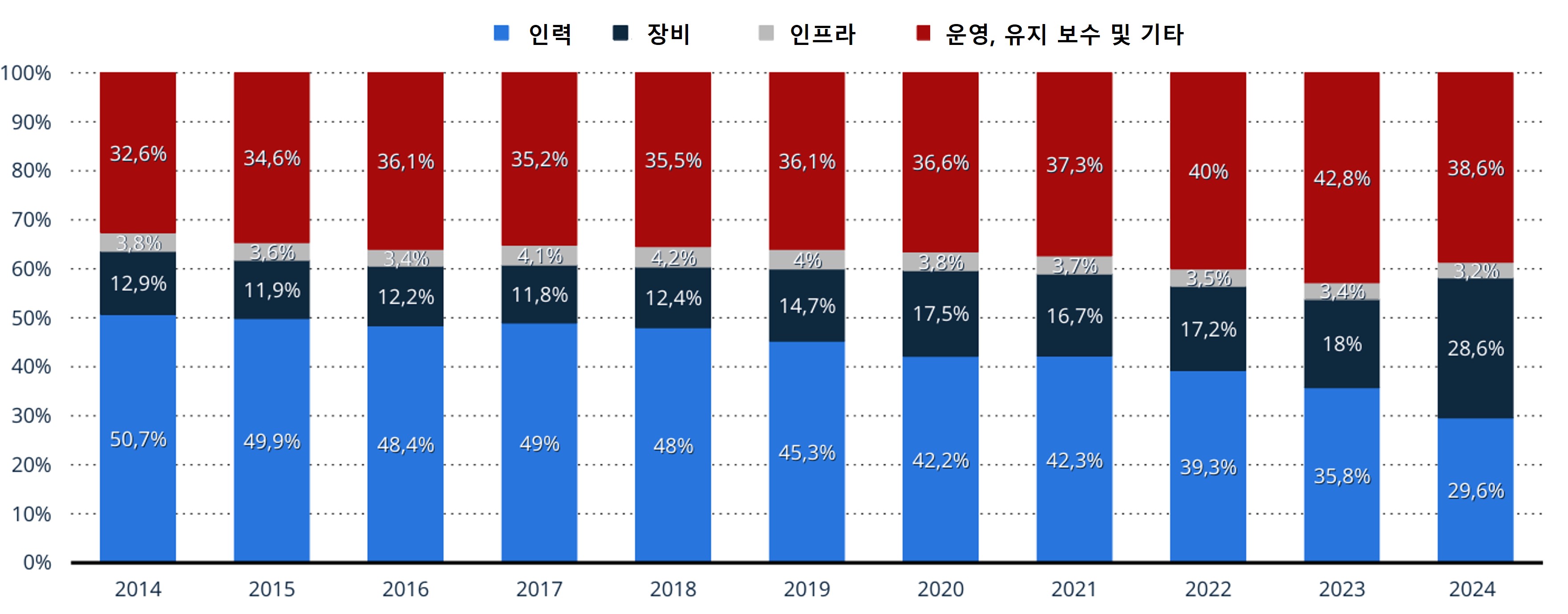 NATO의 2024년 연례보고서에 따르면, 2024년 독일의 국방비는 운영, 유지 보수(38.6%), 인력(29.6%), R&D를 포함한 주요 장비(28.6%), 인프라(3.2%) 순으로 지출됐다. 인건비 비중은 2011년 징병제 중단 후 꾸준히 감소해 온 반면, 장비 지출은 러-우 사태를 계기로 증가 추세를 보이고 있다. 국방 예산 증액과 더불어 무기 수요 급증, 신기술 개발 등으로 독일연방국방부의 장비 지출 규모는 2029년까지 상승세를 계속 이어갈 것으로 전망된다.