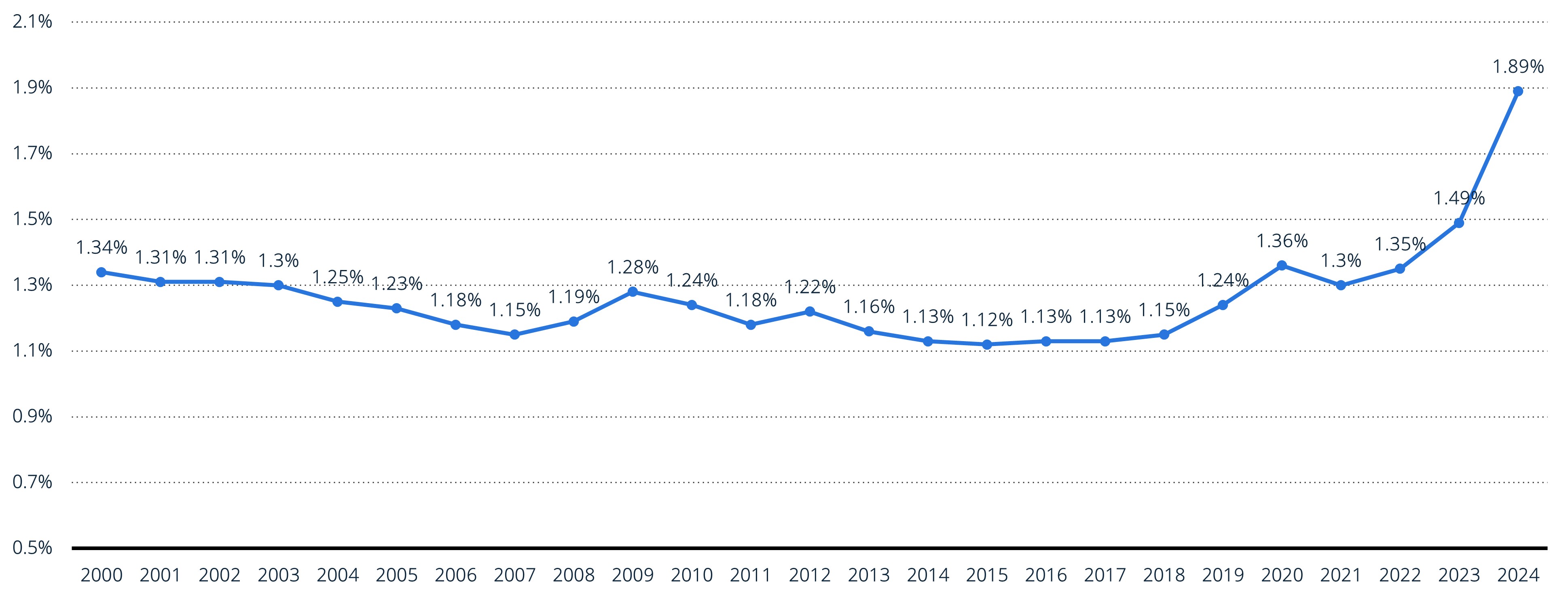<독일의 GDP 대비 국방비 지출 비율(1953~2024)>