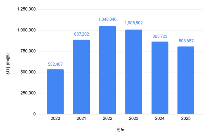 2020년부터 2025년까지 인도네시아 신차 시장은 국내 수요가 산업 생산량을 따라가지 못하며 지속적인 침체를 겪고 있다. 인도네시아는 연간 약 235만 대의 자동차 생산 능력을 유지하고 있으나, 내수 시장의 흡수력 저하로 인해 어려움이 가중되고 있다. 실제로 2025년 판매량은 80만 3,687대에 그치며 전년 대비 7.2% 감소하는 등 고전을 면치 못했다.